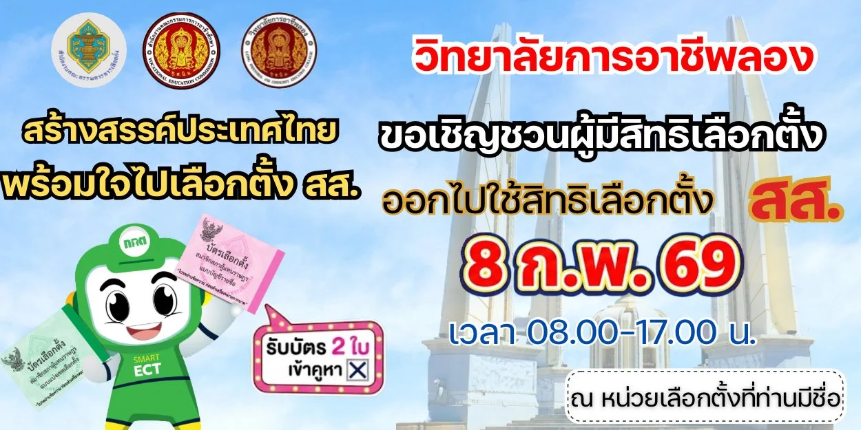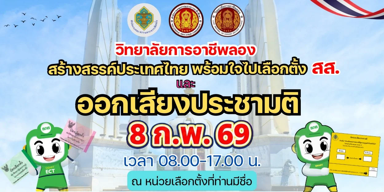 วิทยาลัยการอาชีพลอง ขอเชิญชวนผู้มีสิทธิ์เลือกตั้งออกมาใช้สิทธิ์เลือกตั้ง สส. และ ออกเสียงประชามติ ในวันอาทิตย์ ที่ 8 กุมภาพันธ์ 2569 ณ หน่วยเลือกตั้งที่ท่านมีชื่อ “อย่านอนหลับทับสิทธิ์”