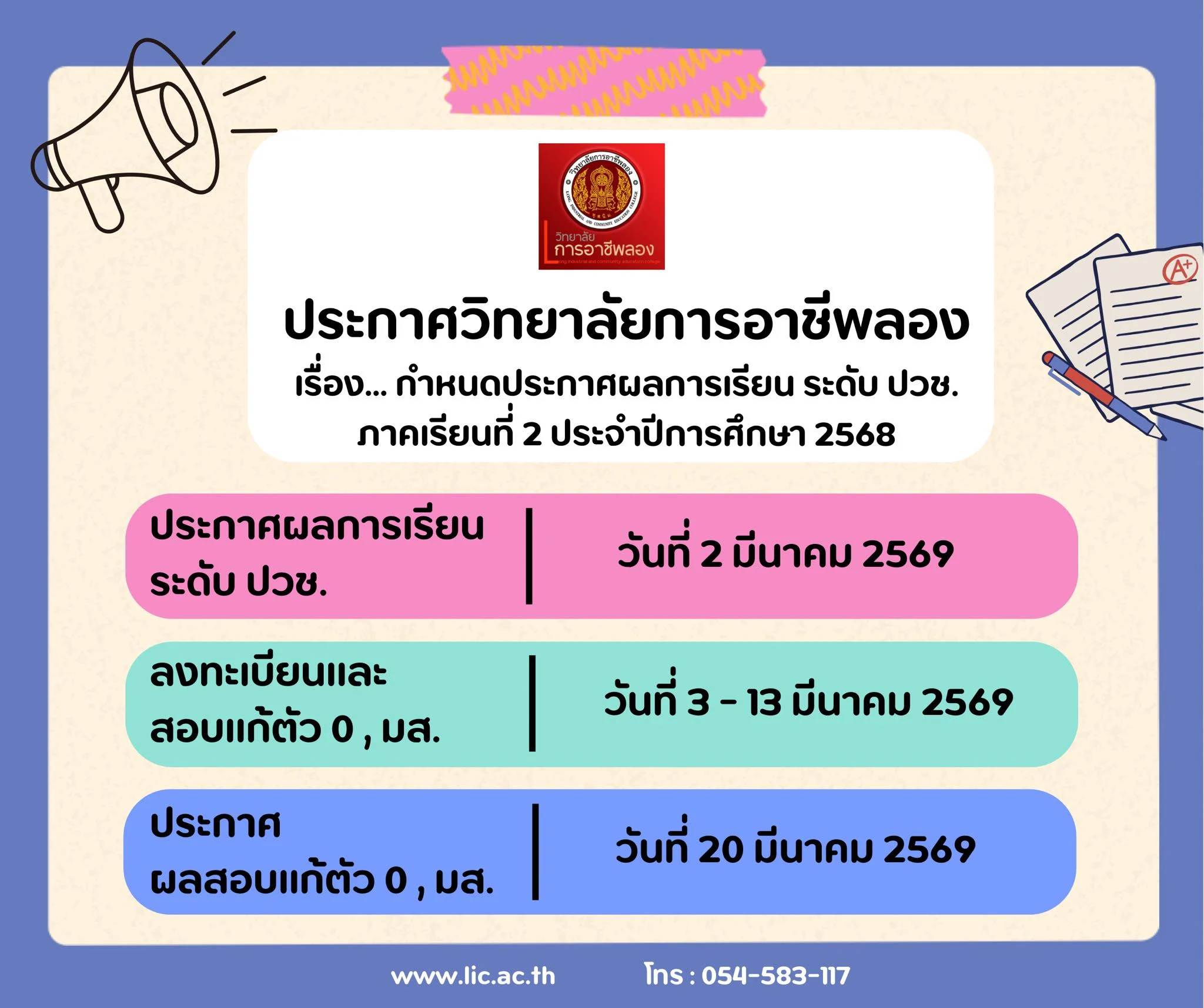 ประกาศ กำหนดวันประกาศผลการเรียนระดับ ปวช. ภาคเรียนที่ 2 ประจำปีการศึกษา 2568