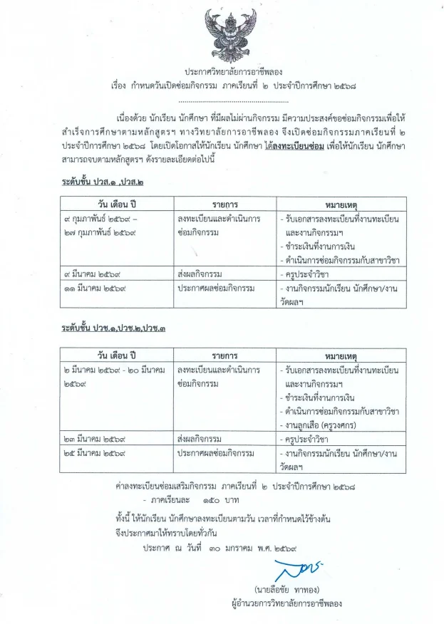 เนื่องด้วย นักเรียน นักศึกษา ที่มีผลไม่ผ่านกิจกรรม มีความประสงค์ขอซ่อมกิจกรรม เพื่อให้สำเร็จการศึกษาตามหลักสูตรฯ ทางวิทยาลัยการอาชีพลอง จึงเปิดซ่อมกิจกรรมภาคเรียนที่ ๒ ประจำปีการศึกษา ๒๕๖๘ ดังรายละเอียดต่อไปนี